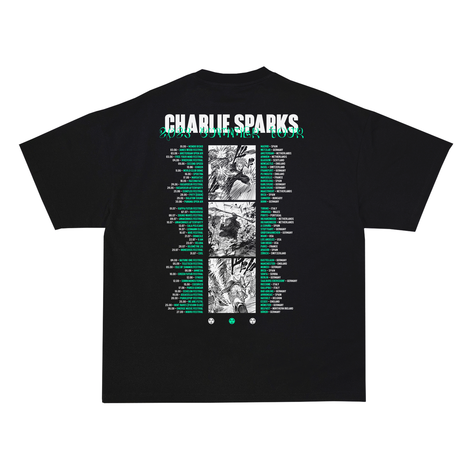T-Shirt mit verwaschenem schwarzen Aufdruck, entworfen von Charlie Sparks zur Erinnerung an seine Sommertournee